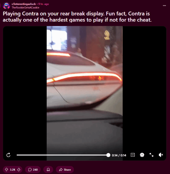 视频显示,其尾部刹车灯屏幕上正在运行8-Bit风格的《魂斗罗》。这款车本身就设计有多个交互式屏幕,而刹车灯正是其中之一。