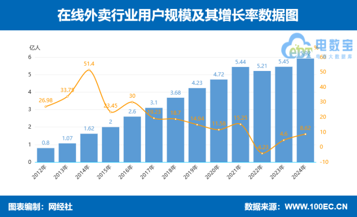 外卖行业的用户规模同样呈现出蓬勃发展的态势。截至2024年12月,我国网上外卖用户规模达5.92亿人,较2023年12月增长4777万人,占网民整体的53.4%。这意味着超过一半的网民都曾使用过外卖服务,外卖已成为大众日常生活中的常态化消费选择。