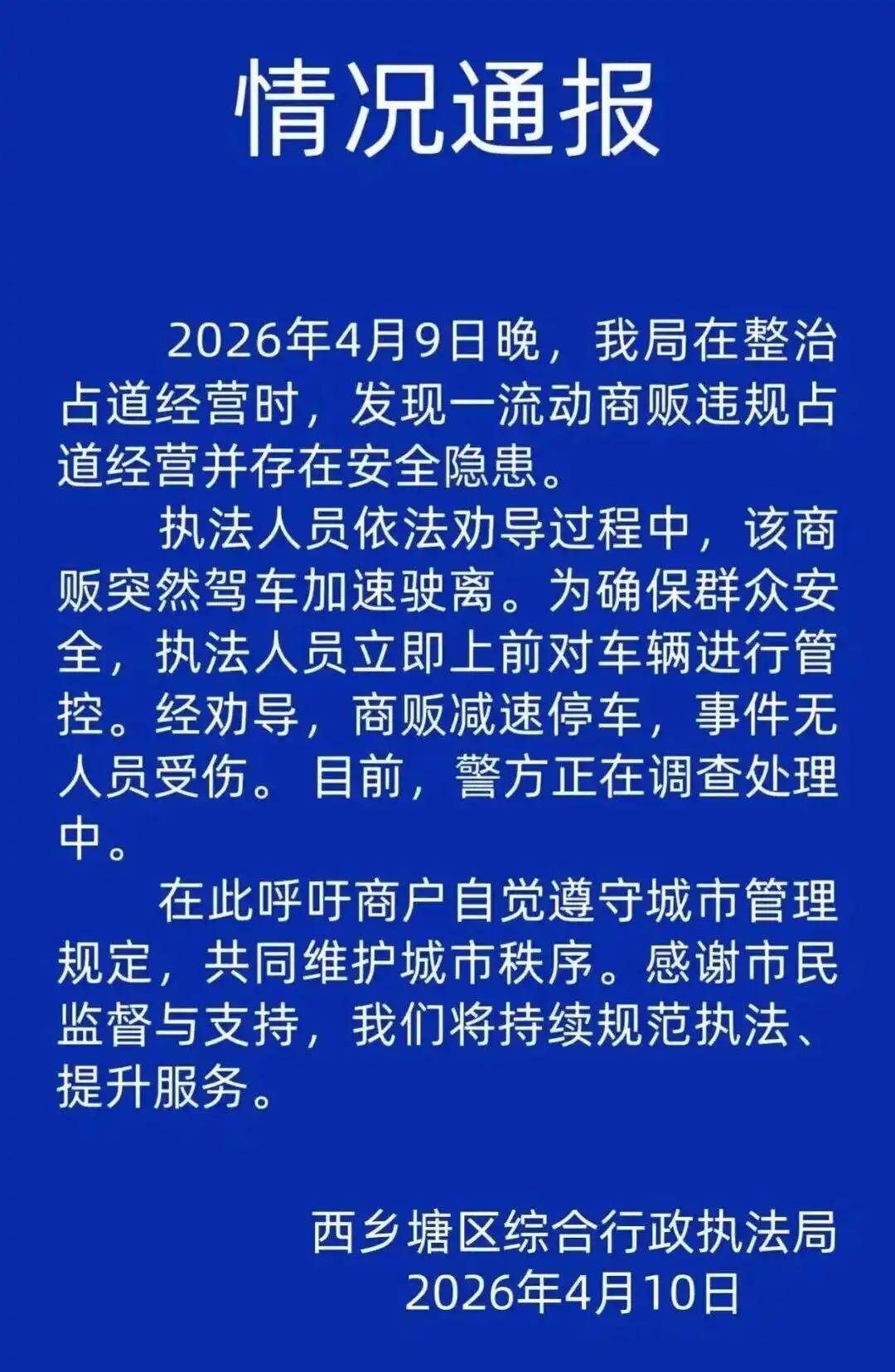 4月10日,广西南宁西乡塘区综合行政执法局发布情况通报:2026年4月9日晚,我局在整治占道经营时,发现一流动商贩违规占道经营并存在安全隐患。在执法人员依法劝导过程中,该商贩突然驾车加速驶离。为确保群众安全,执法人员立即上前对车辆进行管控。经劝导,商贩减速停车中国股票配资网在线登录,事件无人员受伤。目前中国股票配资网在线登录,警方正在调查处理中。在此呼吁商户自觉遵守城市管理规定,共同维护城市秩序。感谢市民监督与支持,我们将持续规范执法、提升服务。